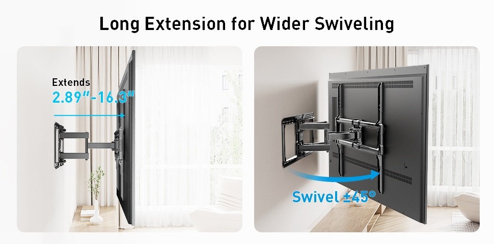 Ultimate Viewing Freedom: PERLESMITH TV mount offers unparalleled flexibility with a wide range of motion, including a +/-45° swivel capability, and easy tilt adjustment from +5° to -15° to eliminate glare. Extend your TV up to 16.3" for immersive viewing or retract it to just 2.89" to save space. Enjoy effortless control over your viewing experience.