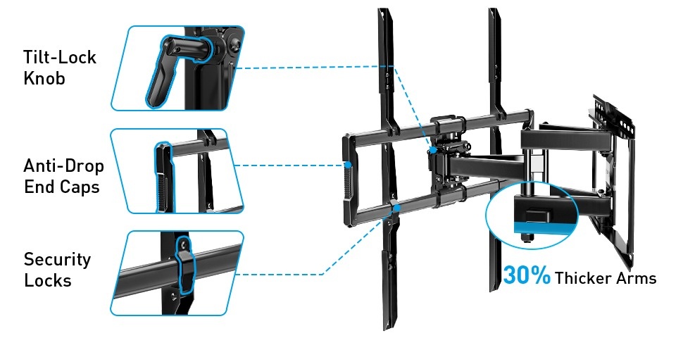 Superior Stability: Crafted with enhanced high-strength steel, PERLESMITH full motion TV wall mount offers exceptional durability, ensuring unparalleled stability for TVs weighing up to 160 lbs. Rest assured knowing that your TV is securely supported.