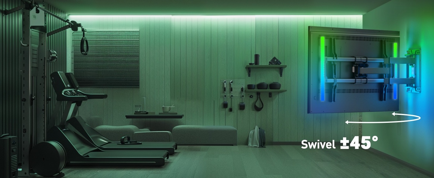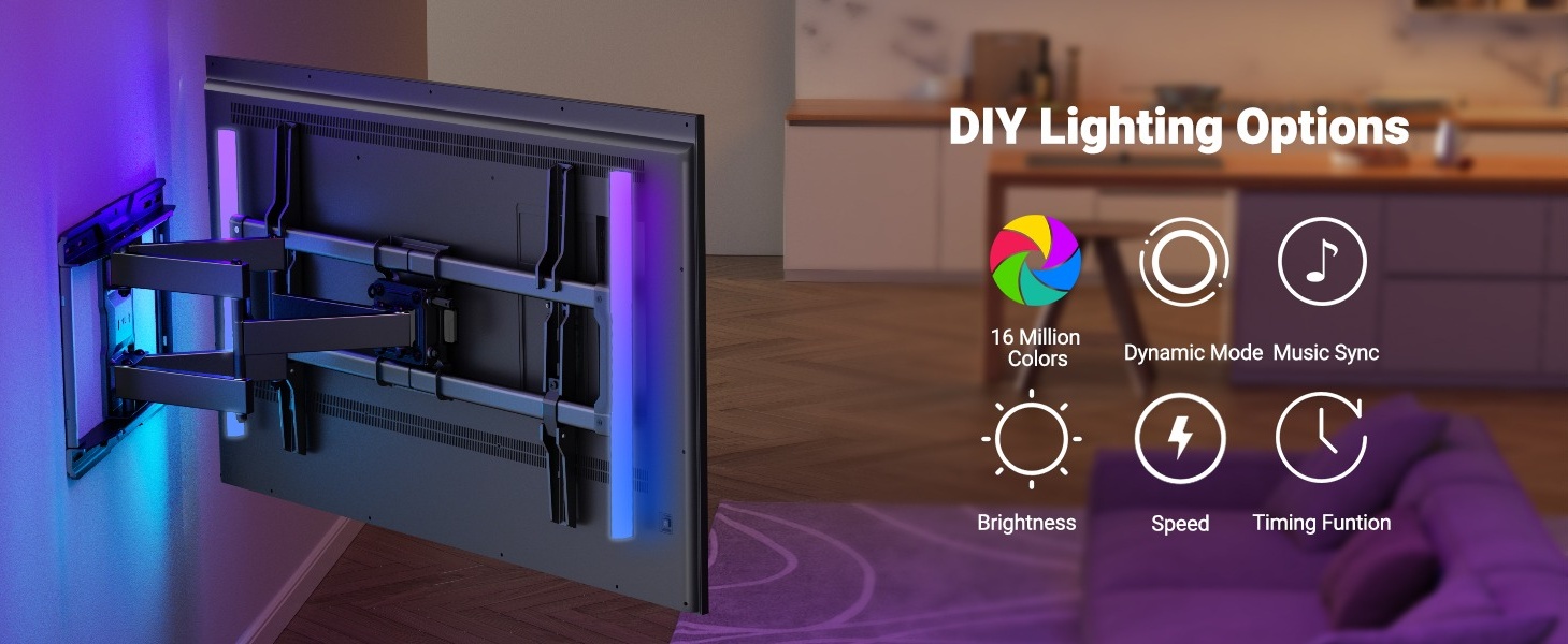 Integrated RGB/Rhythm Light: This Wall Mount TV Bracket features DIY music rhythm light with three ways to operate including a mobile app, remote control, and in-line switch. Customize using 16 million colors, brightness, speed, modes, and a timer function. Music sync changes LED light color to match the rhythm of your music.