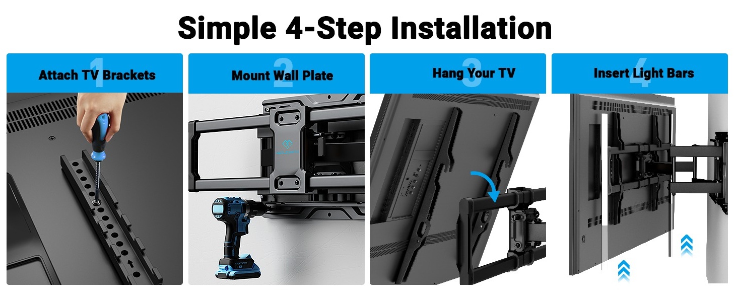 Wide Compatibility: The TV mount with light bar is compatible with most 37″-86″ flat or curved TVs up to 132lbs with VESA patterns 200x100 to 600x400mm. The 86-inch TV Wall Mount can be installed on 12″ to 16″ on center wood studs, solid concrete or concrete block surfaces. Please verify your TV size, wall structure, weight, and VESA pattern of your TV before your mount purchase.